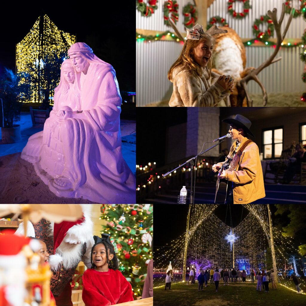 1,200,000+ Lights • Arctic Adventures Zip • Arctic Adventures Aerial Course • Glacier Express Escape Room • Live Music • Community Performance Stage • Trail Rides • S’Mores • Local Food Vendors • General Store Shopping with Local Vendors • Snow Zone with Real Snow • Sledding Hill • Overnight Lodging • Dinner Theatre with A.D. Players • Petting Farm • Larger-Than-Life Nativity • Gingerbread Creations • Crafts • Meet Santa in His Workshop • Rolly the Talking Reindeer • And More!